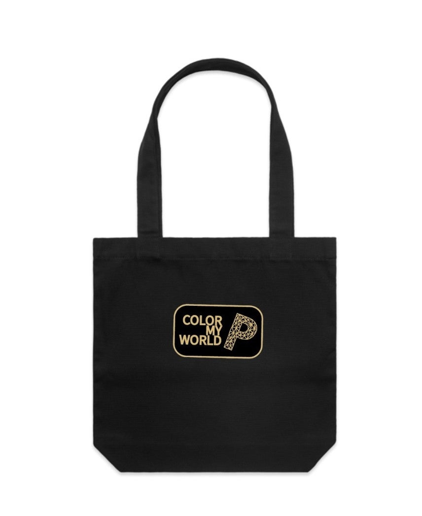Introducing the Rhodonite Dragon Carrie Tote, the perfect blend of durability and eco-friendliness. On one side of the bag, the tote features a striking red dragon on a sleek silver triangular plate, adding a touch of elegance to a classic bag. On the other side is the iconic Color My World patch. Expertly crafted, this tote is the ideal accessory for all your daily needs.