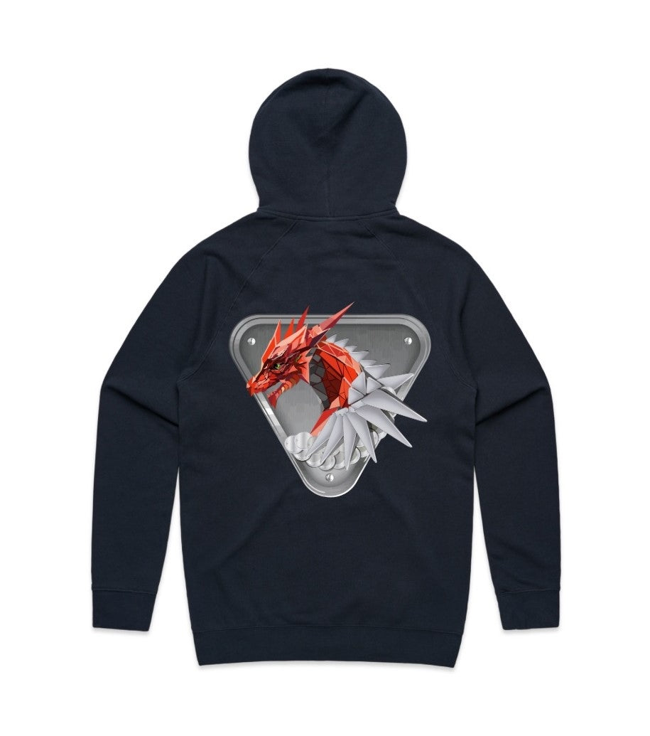 At the back is an epic design of a mesmerizing red Rhodonite Geometrical Dragon with intricate silver armour, framed by a striking triangle metallic plate. The sleek zipped front enables easy layering and adaptable wear. The hoodie is made of high-quality cotton for unmatched softness and warmth, perfect for any season, and is part of a unique series celebrating the Year of the Dragon, making it a rare collectible.