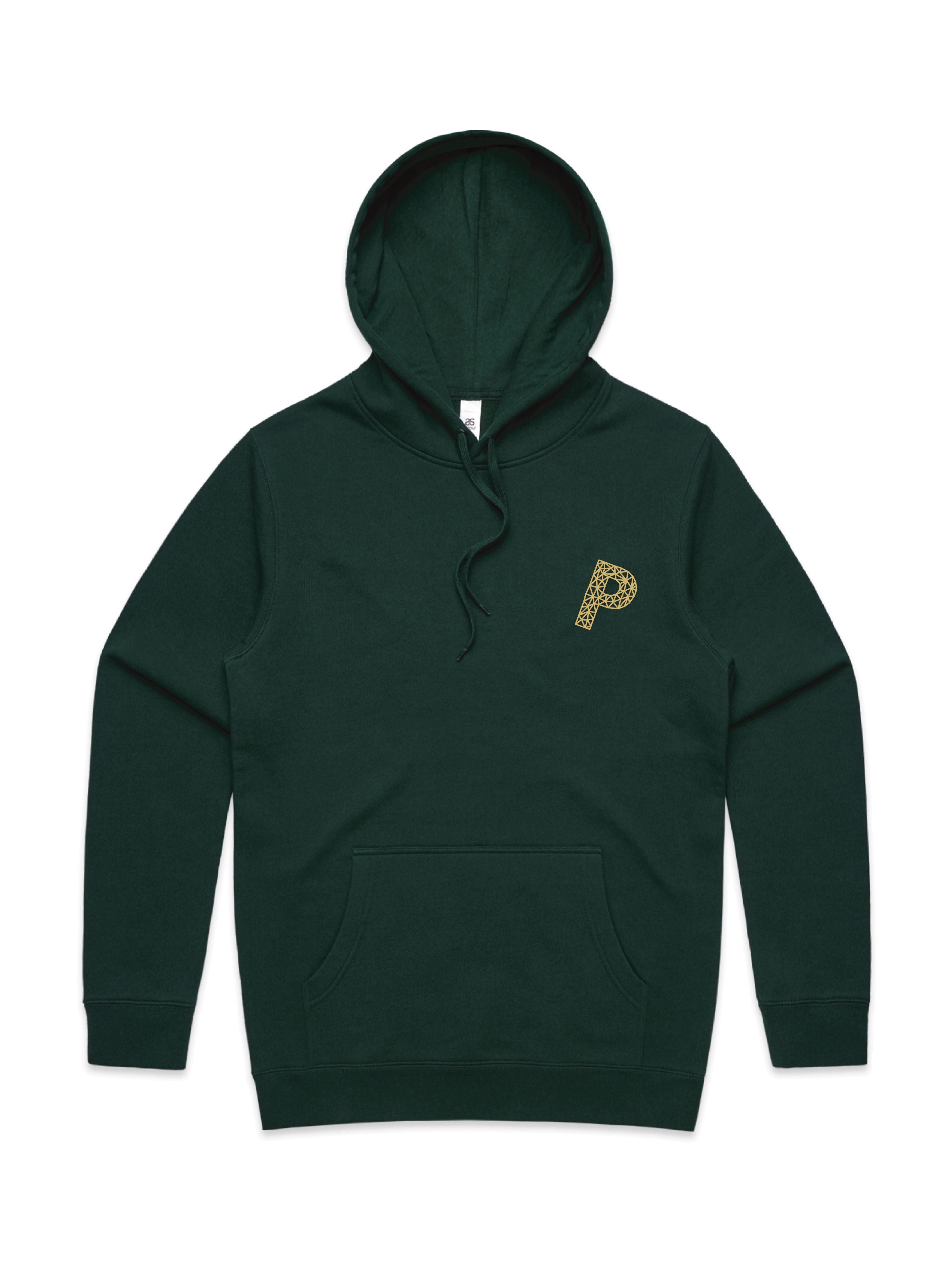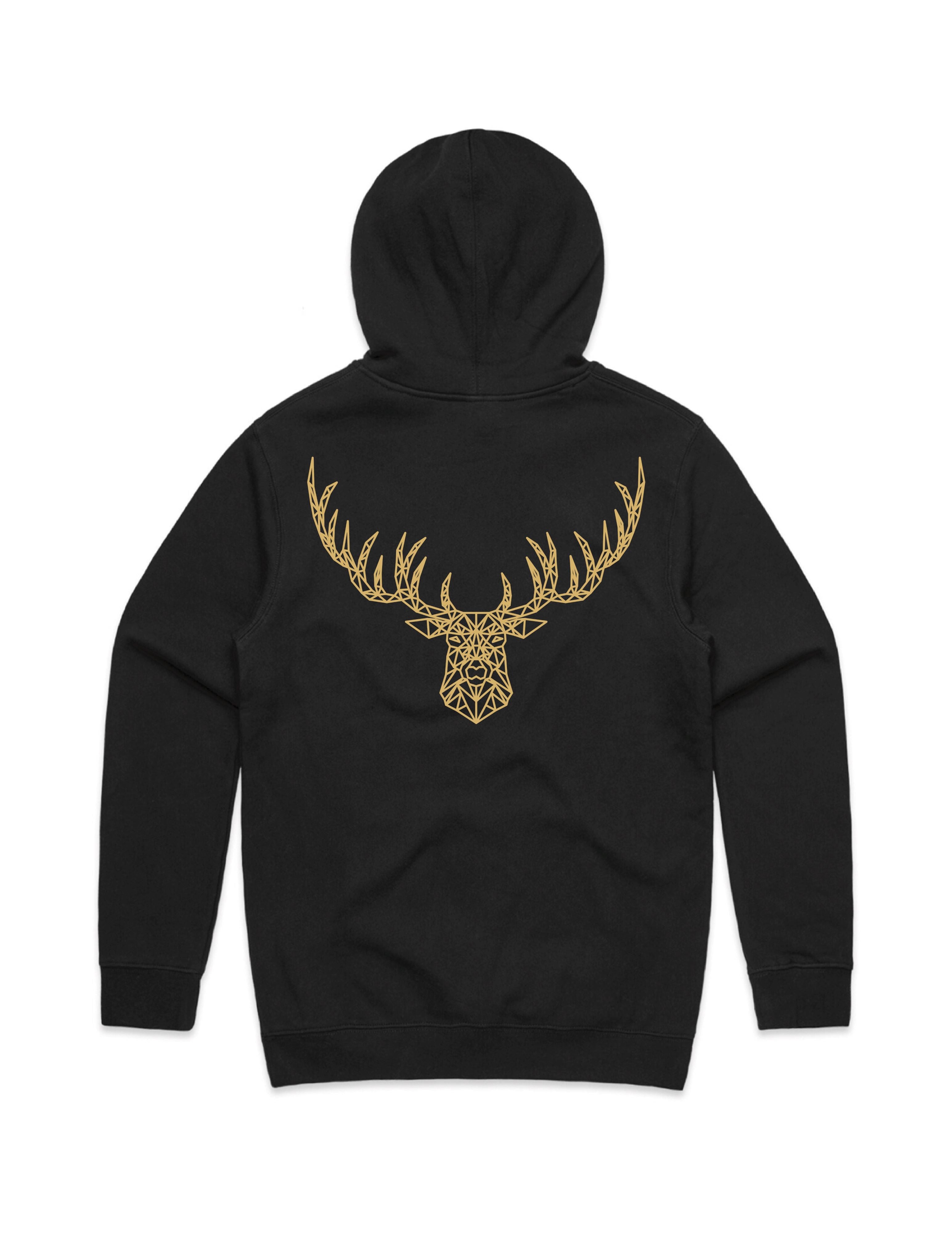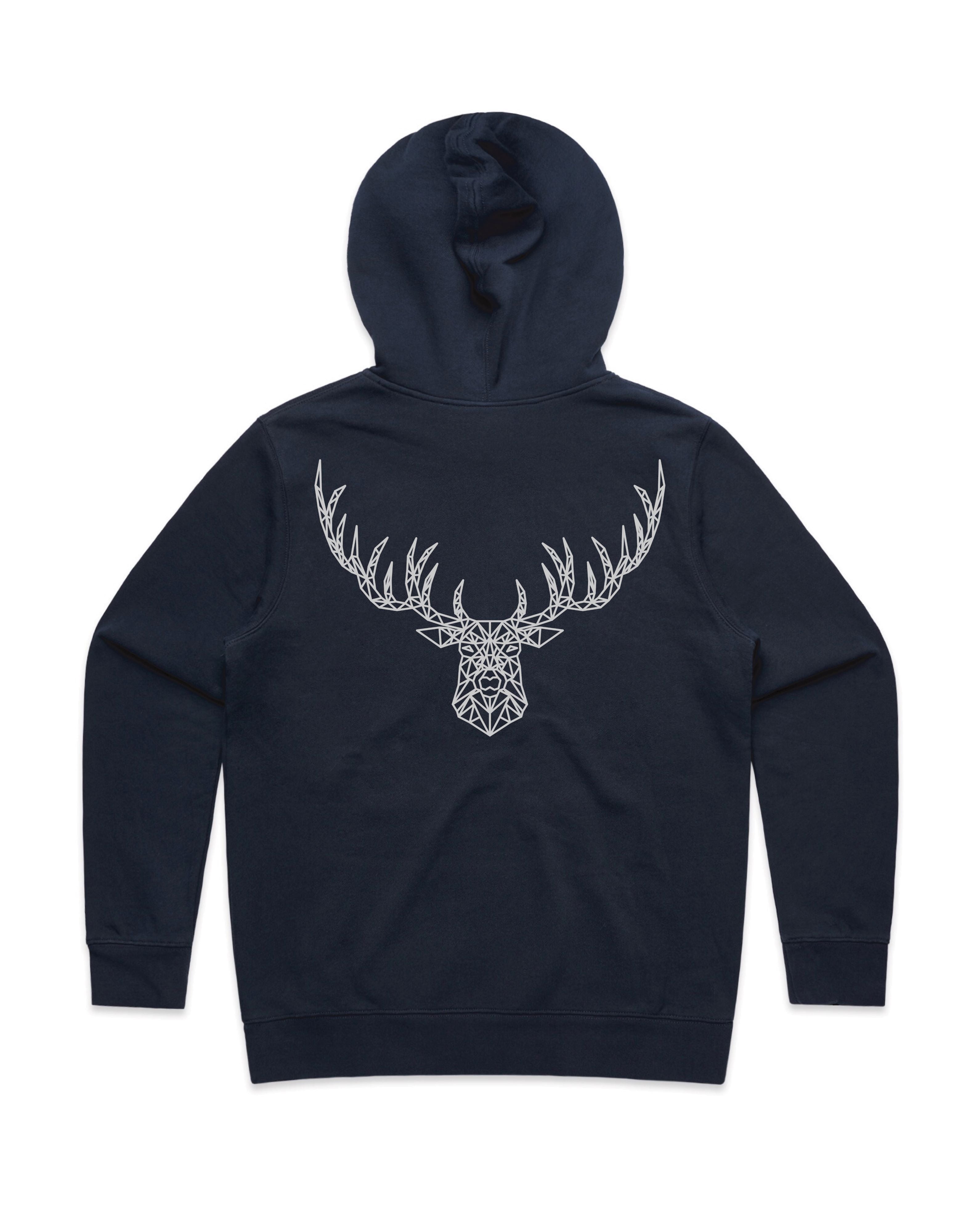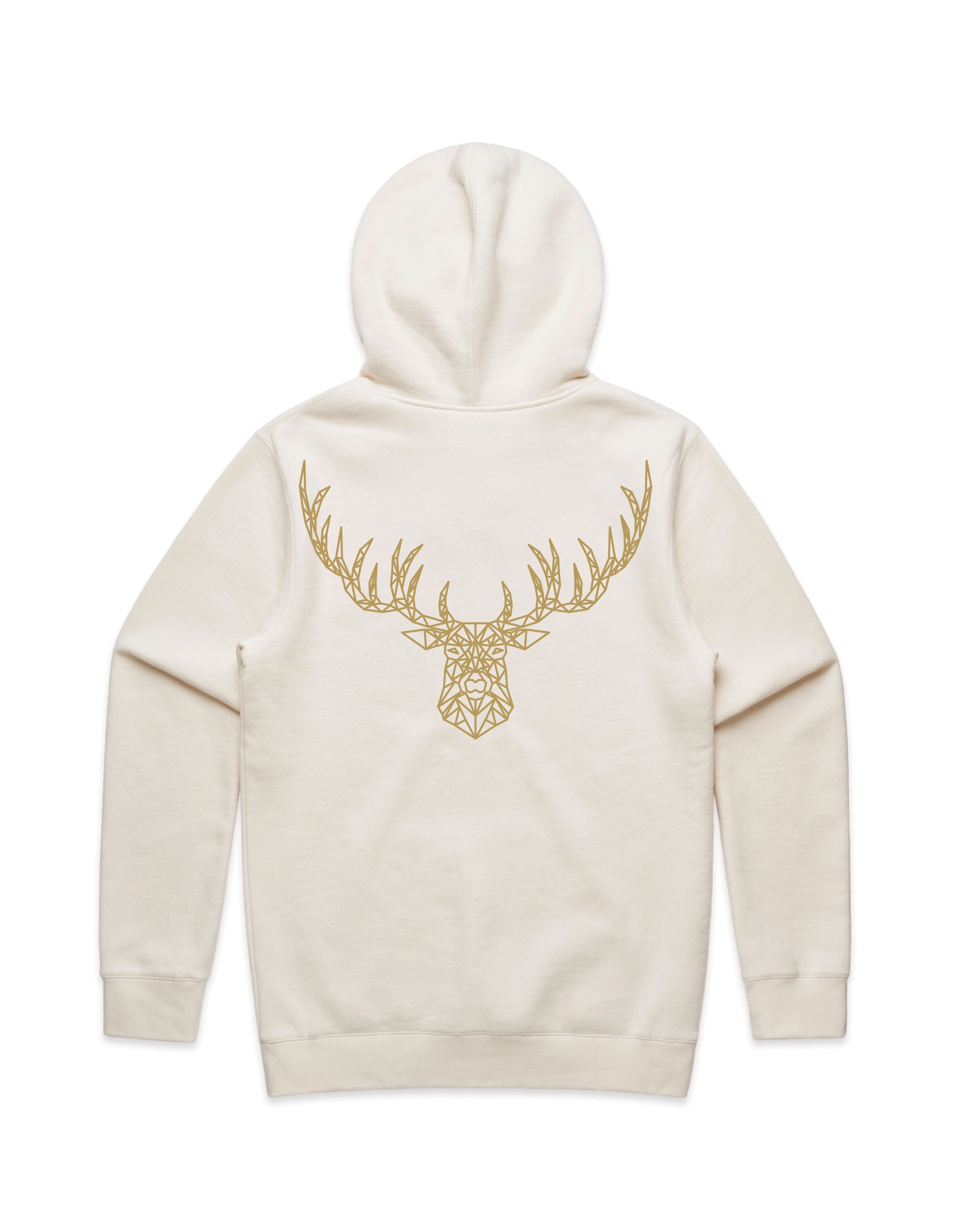 Gold embelishment for black, pine green and ecru hoodies. Silver embelishment for cobalt and navy hoodies