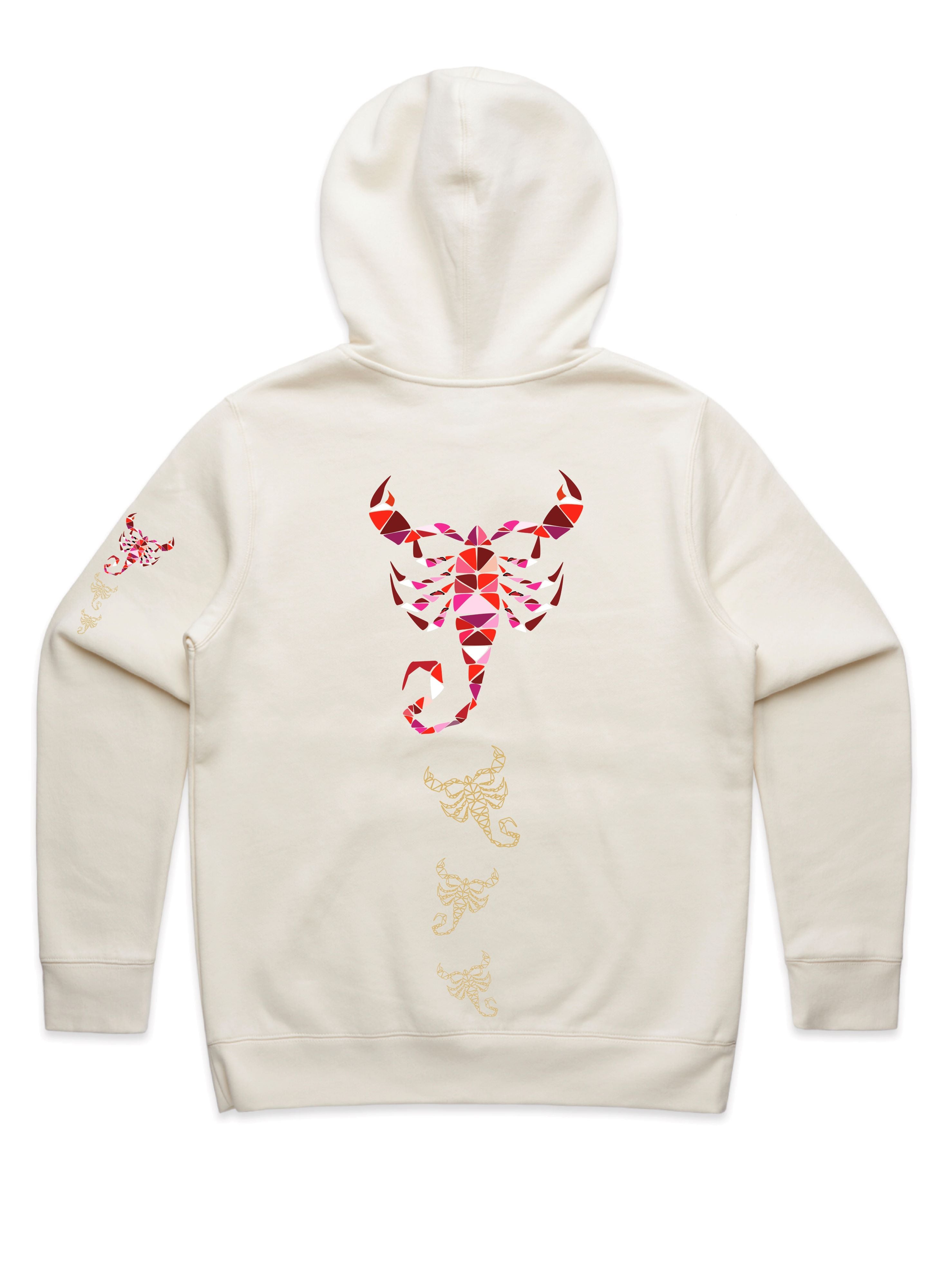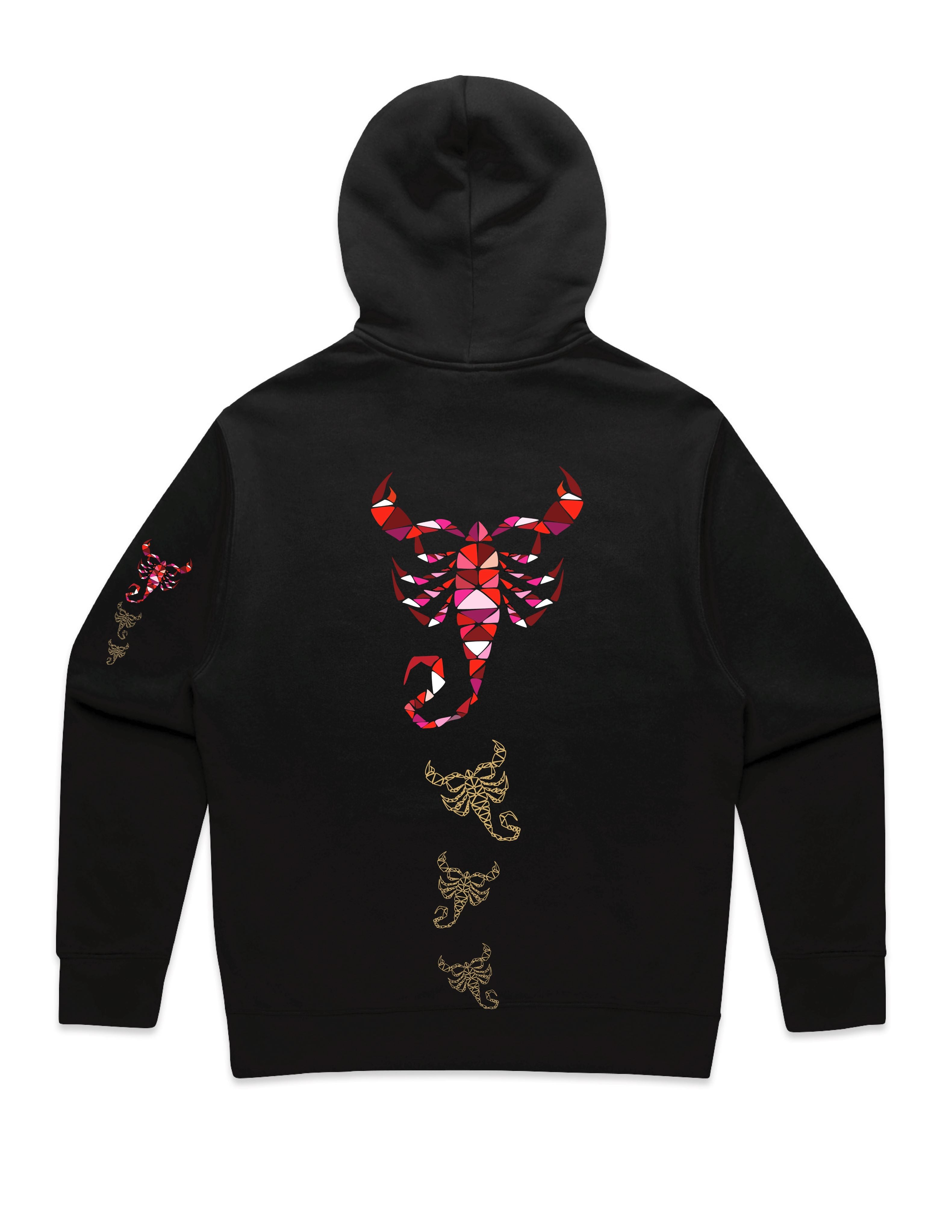 We are thrilled to unveil "The Sting," a celestial masterpiece that embodies the essence of the Scorpio star sign. In the heart of "The Sting," you'll find a bold and vibrant red mosaic scorpion, with its stingers defiantly facing upward, symbolizing Scorpio's fearless determination. Positioned proudly in the middle at the back of the hoodie, it's a statement of strength and resilience. Beneath this majestic Scorpio, you'll discover three smaller scorpions, depicted in intricate golden scaffolds, representing the journey of Scorpio's ascent. The three scorpions crawl upward, mirroring the upward trajectory of Scorpio's ambition and intensity. It's a visual narrative of growth and self-discovery.