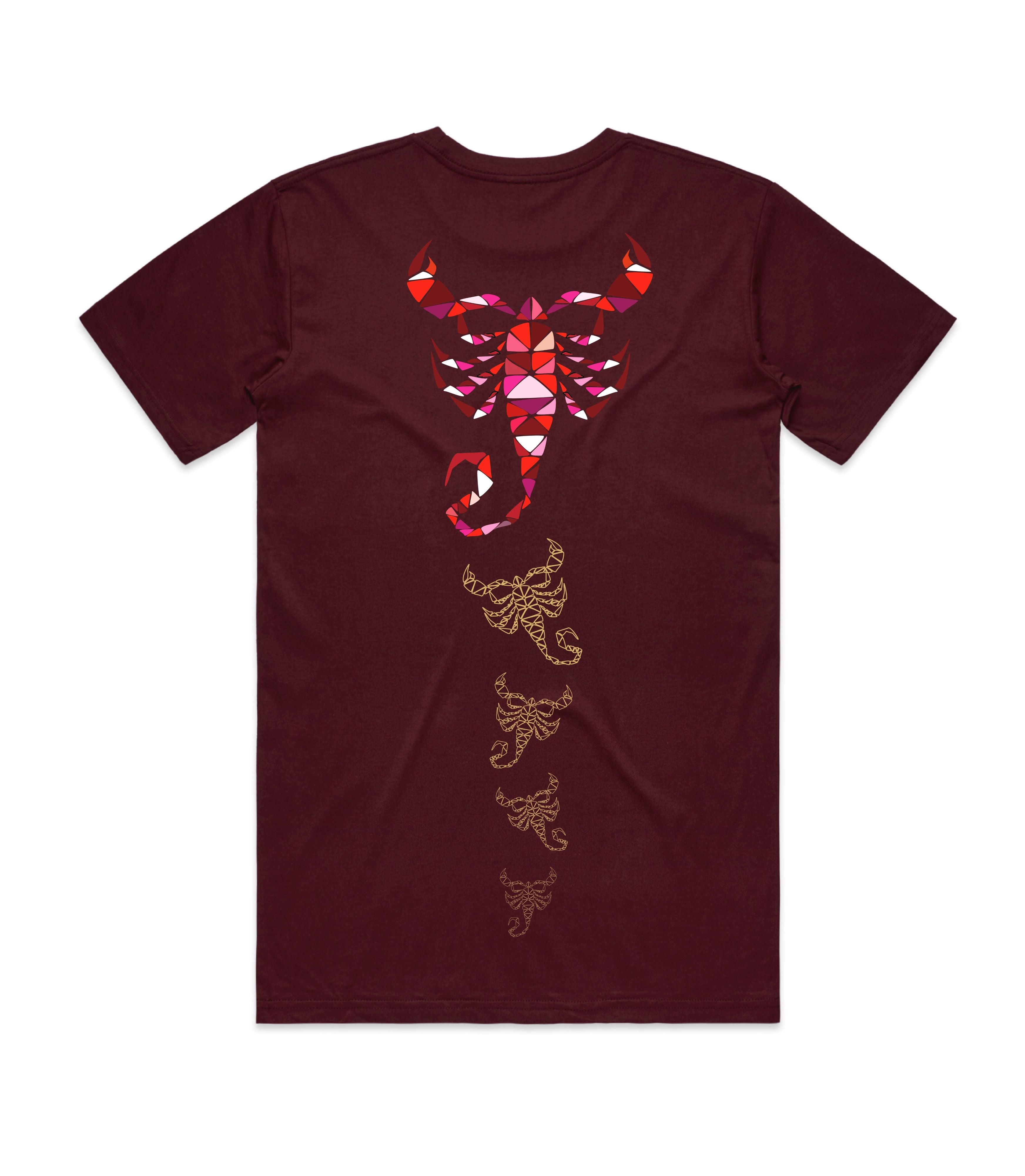 Positioned prominently at the center of the t-shirt's back, this majestic Scorpio makes a bold statement, representing strength and resilience. But the symbolism doesn't stop there. Beneath this striking Scorpio, you'll discover four smaller scorpions, intricately depicted in golden scaffolds. They symbolise Scorpio's journey of ascent, crawling upward in unison, mirroring the sign's ambition and intensity. It's a visual narrative of growth and self-discovery that adds depth to this celestial artwork.